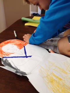 I do these handy dandy drawings (more with Milton and the animal kid to come) to entertain you and also so that I can be engaged in my kids’ creation of ancient Egyptian mummies instead of sitting on my computer…. My 4-year old tells me “Mommy, you aren’t an artist, but at least you did your best” (I attribute his reality-based assessments to his being raised on a healthy dose of CBT 🙂 Also, he likes kneeling on the table while he engages in his craft. Who am I to judge his process?